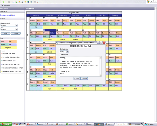 To satisfy the need to display recurring schedules, the administrator can set up a master schedule which will repeat itself every six weeks. The administrator can easily alter the schedule by selecting a date on the calendar and modifying the scheduled analysts for that date. A comments field is also provided for the Administrator to track why there was a schedule change on a given date.